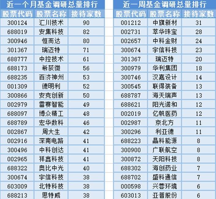 从个股调研情况上来看,最近1个月(5月6日-6月5日)最受公募基金关注的是汇川技术,属于工业自动化行业、电梯行业、新能源汽车行业,主营业务为通用自动化、智慧电梯、新能源汽车、工业机器人、轨道交通,共有90家基金管理公司参与调研,其次是安集科技和恒而达,分别接受82家、80家基金管理公司的调研。