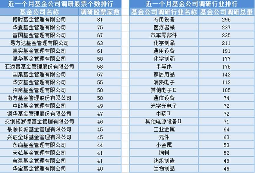 近一个月(5月6日-6月5日),博时基金参与公司调研的数量最多,共调研81家上市公司,然后调研较为活跃的还有华夏基金、富国基金和易方达基金,分别调研75家、67家、63家上市公司;从调研行业上来看,基金公司对专用设备行业的上市公司调研次数最多,共有296次,其次是医疗器械行业,基金公司调研了237次。